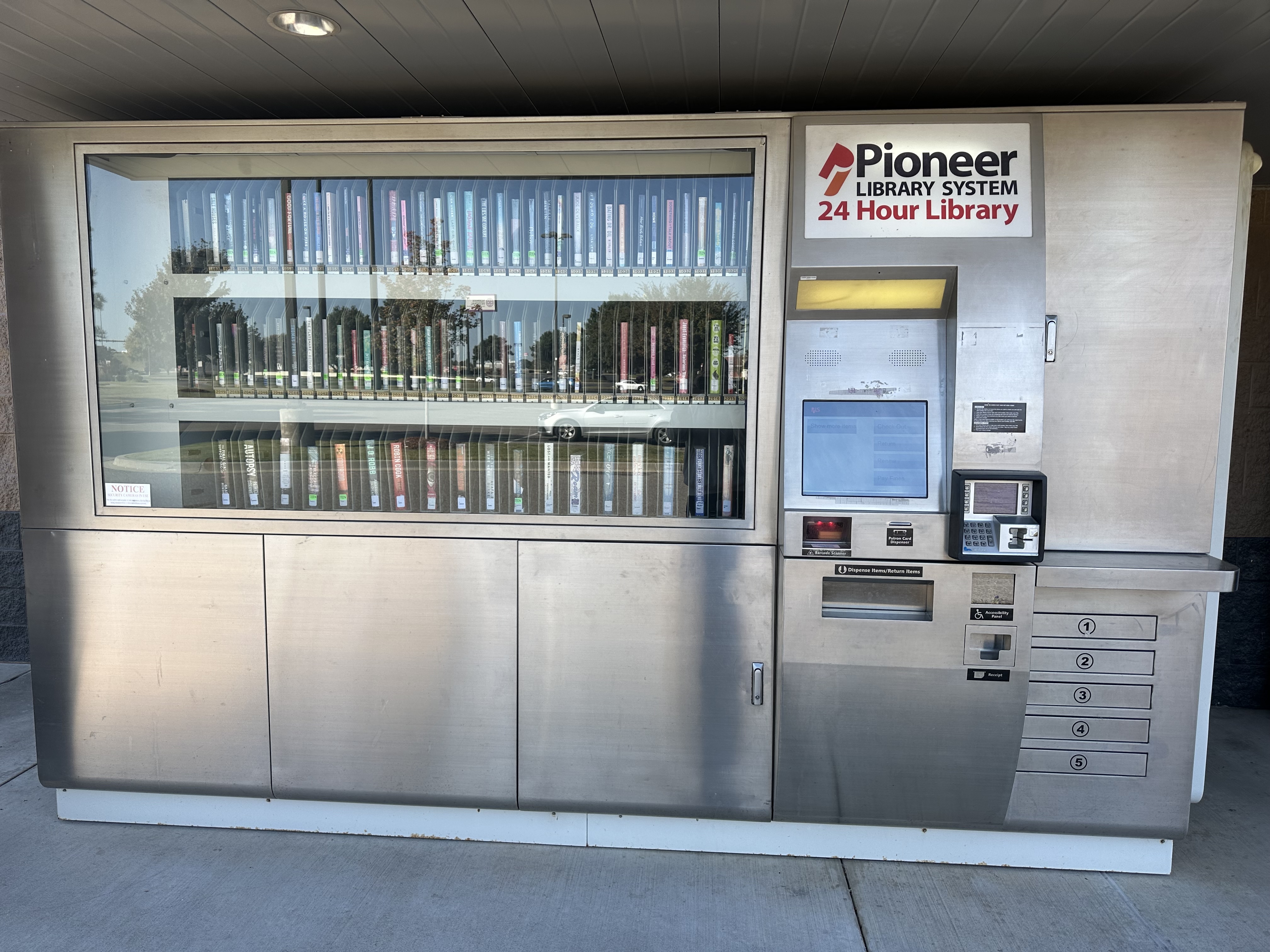 A self-service kiosk that allows patrons to pick up and return library materials outside of staffed hours.