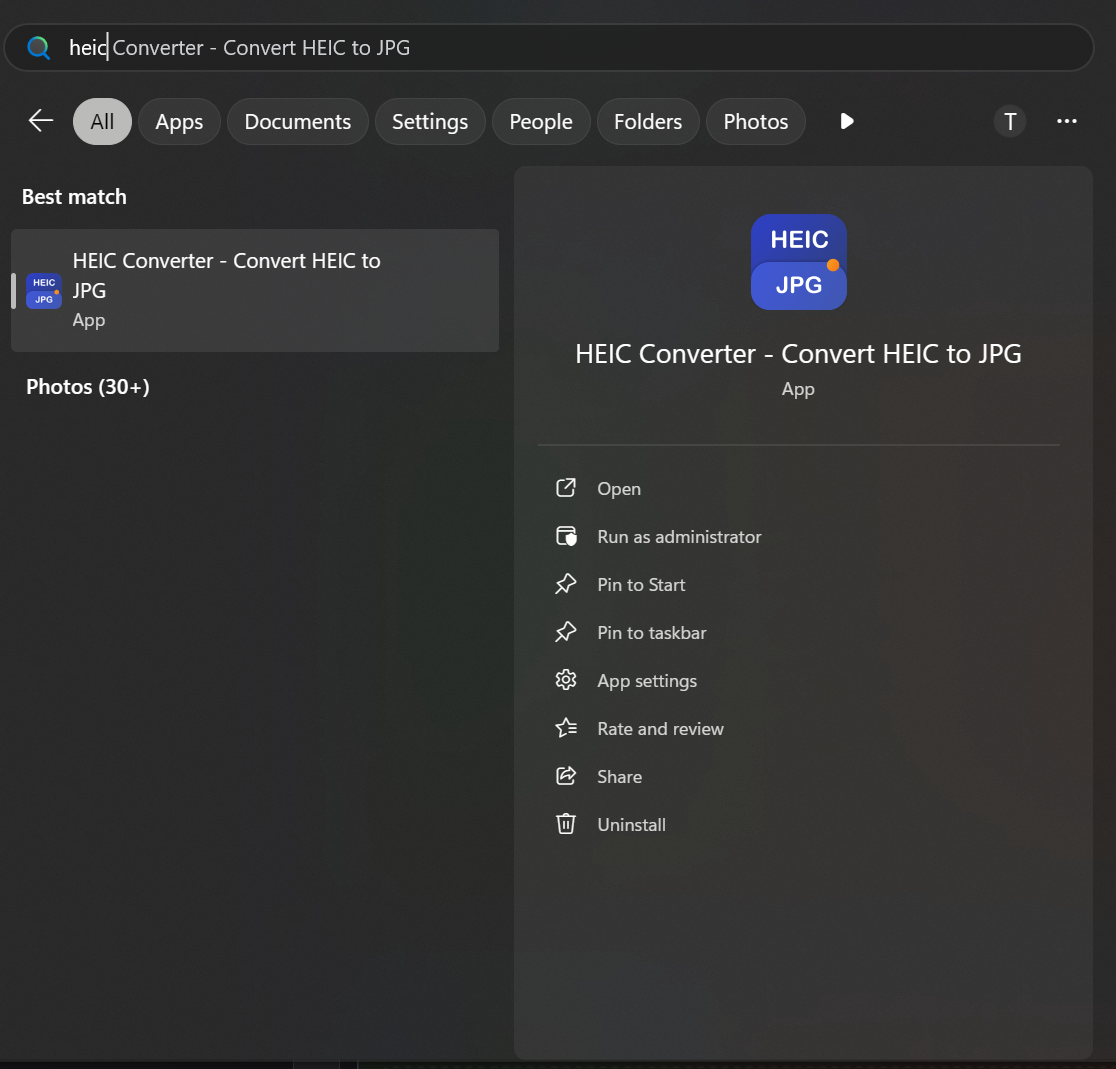 The converter may now be found by searching "HEIC" in the Windows Start menu.