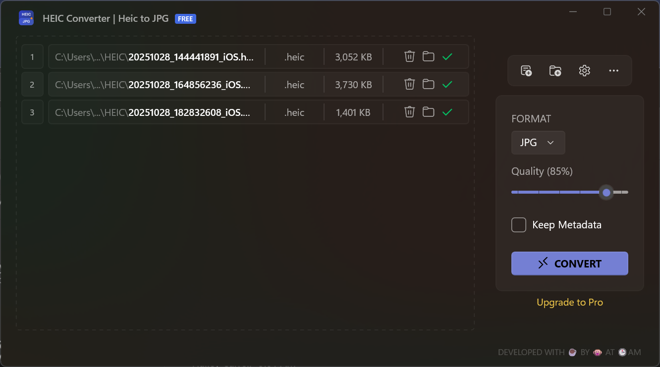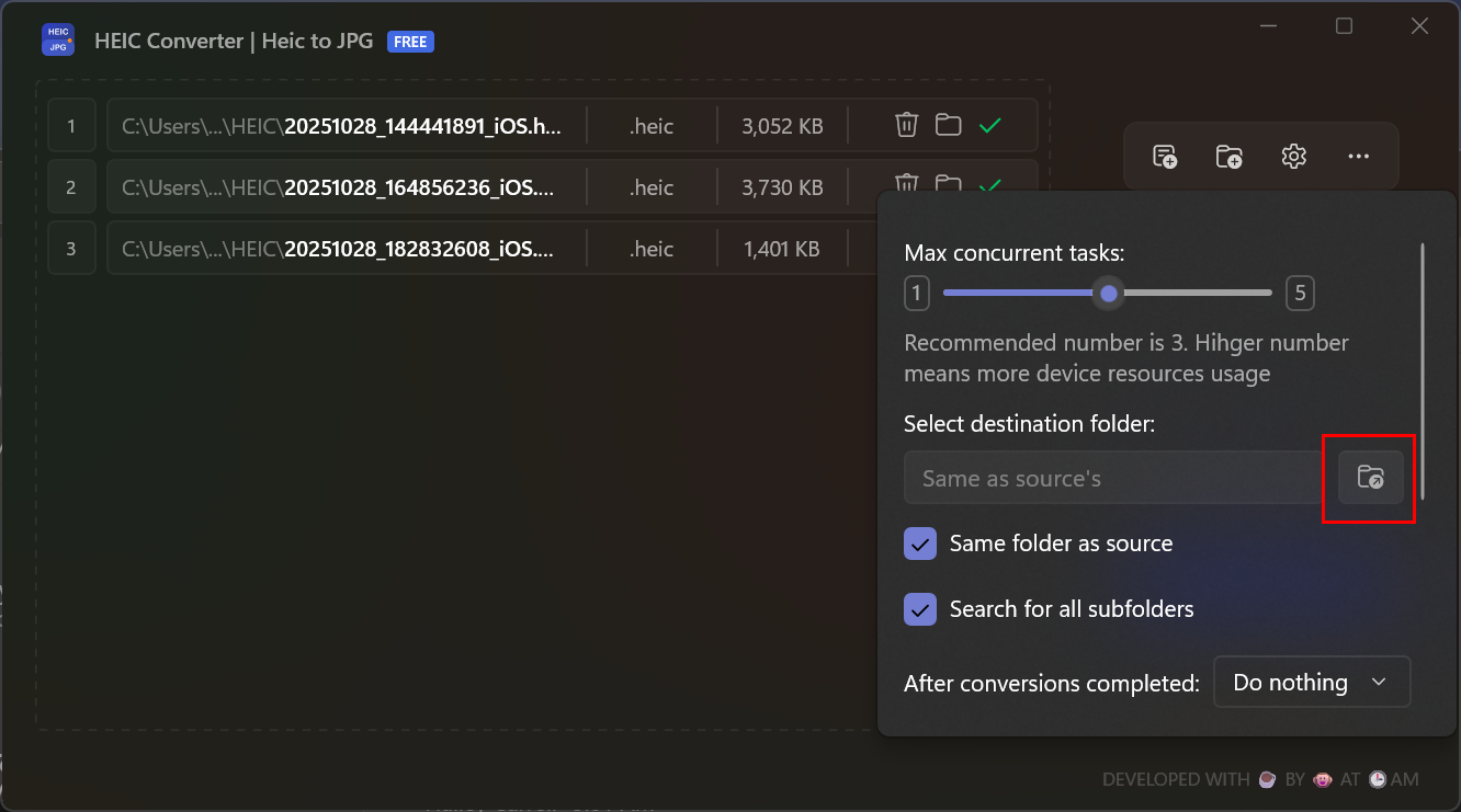 By default, converted images are saved in the same folder as the original HEIC file. See the next section to change where converted files are saved.