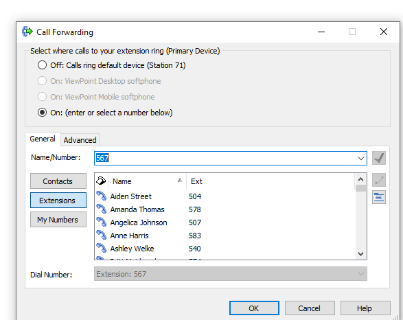 Tip: If you want forwarding to remain active even after logging into ViewPoint again, set up a Call Rule instead of using the Call Forwarding option. Call Rules are server-based and stay active until you disable them. See Setting Up Call Rules for more details.