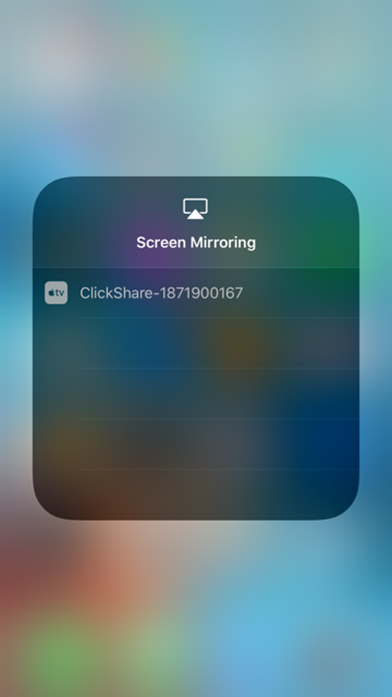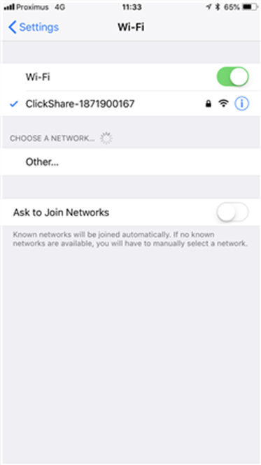 ***NOTE – Due to security reasons once you are connected to the ClickShare devices network you will be unable to access other Wi-Fi networks. Meaning, unless your iOS device has cellular capability, you will be unable to access the internet while Screen Mirroring.