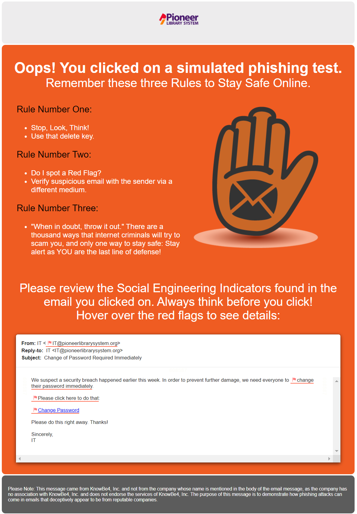 We want to ensure we are able to identify these threats so we have partnered with KnowBe4 a leader in security awareness training. Our goal is to increase security awareness and decrease the likelihood that Pioneer becomes a victim of malicious actors. Beginning in June 2024 , we will use their platform to perform regular phishing tests for all employees and utilize their training library to educate staff on identifying phishing attempts.