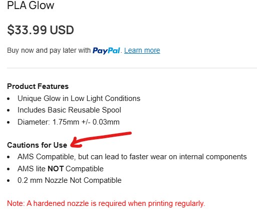 Some types of filament can only be used with specific Bambu 3D printer models, require specific nozzle sizes or types, or require a specific type or lack of an AMS (Automated Material System). When looking at filament in the Bambu Lab store, look at the Cautions for Use section and be sure that you are not requesting a filament that is incompatible with your 3D printer. After receiving filament that can only be used in specific situations, be sure to label the filament with the restrictions so it is not accidentally used incorrectly or installed in an incompatible 3d printer model.