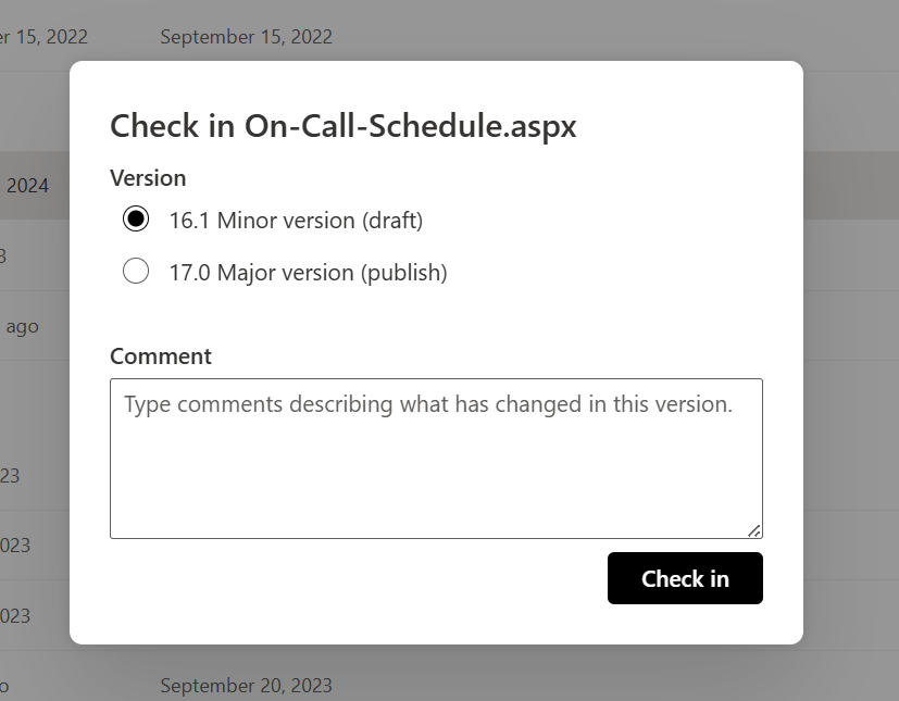 There may be instances where files in a Sharepoint library (Team sites, pages, document libraries) where a user has a file checked out, preventing others from editing or publishing the file. This is by design. Sometimes a user may have checked out a seldom used file that needs to be updated, and the user had not checked the file in. If the user is unavailable (on vacation, out sick, or no longer with PLS), the owner of the Sharepoint library has the ability to check in the file for the user.